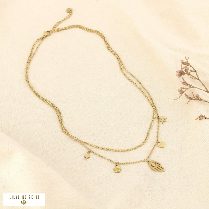Ce collier en acier inoxydable séduit par son design multi-chaînes et ses pampilles délicates aux inspirations symboliques. Composé de deux rangs distincts, il associe une chaîne maille classique à une chaîne fine ornée de breloques (étoiles, médailles texturées et motif main protectrice), pour un rendu moderne et structuré.