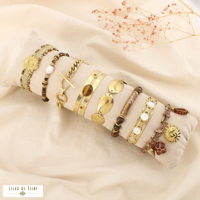 Proposez à votre clientèle un set de 8 bracelets en acier inoxydable et pierres naturelles au design solaire et bohème chic. La référence 0226151 se distingue par la richesse de ses textures, l’harmonie des tons dorés et bruns, et la diversité de ses formes, pensée pour créer un effet d’accumulation maîtrisé, très recherché en boutique.