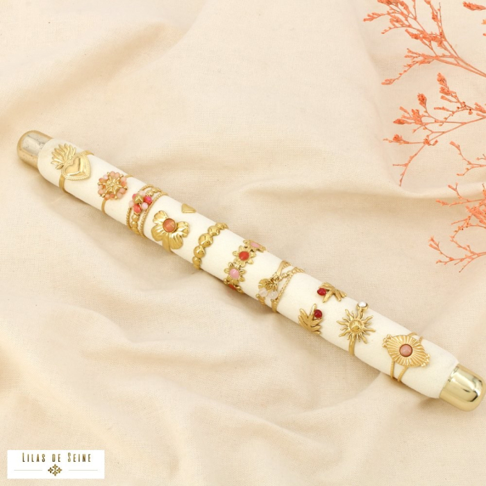 Ensemble 10 Bagues Réglables en Acier Émail & Pierres Naturelles 0426064 rose nude