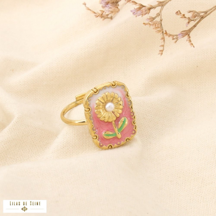 Cette bague s’inscrit dans la tendance forte des bijoux acier émaillés à inspiration florale, combinant modernité de la structure double anneaux et esprit romantique du motif. Son format généreux lui confère une présence affirmée en vitrine, tout en restant facile à porter.