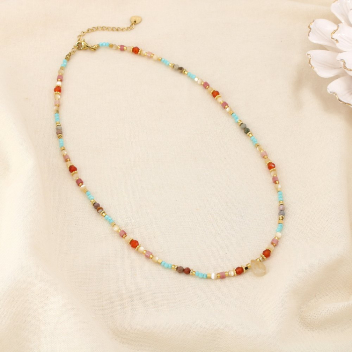 Apportez douceur et modernité à votre sélection avec ce collier en acier inoxydable, sublimé par un assemblage harmonieux de perles de cristal, rocailles et pierres naturelles. Ses nuances rosées délicates, ponctuées de touches colorées, en font une pièce tendance idéale pour la saison.