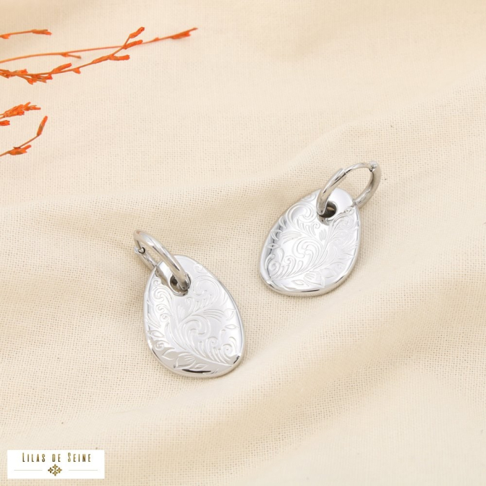Chaque boucle d’oreille associe une petite créole lisse à un pendentif ovale texturé (dimensions environ L18 x H30 mm). La surface du médaillon est ornée d’une gravure végétale et arabesque subtilement ciselée, offrant un jeu de relief raffiné et une belle captation de la lumière.