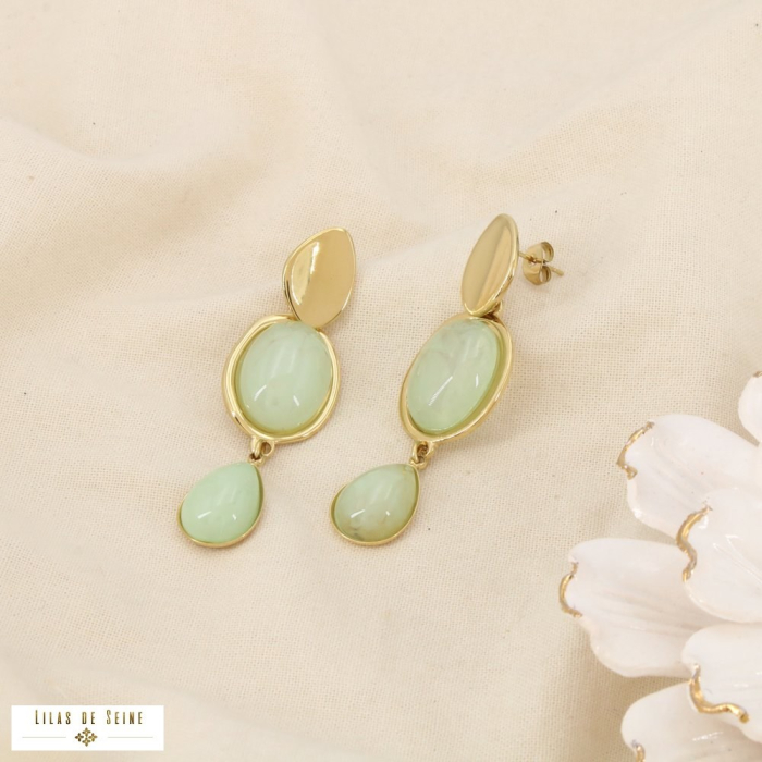 Chaque boucle (environ L15 x H55 mm) se compose d’un élément supérieur lisse et doré fixé au lobe par une tige avec fermoir papillon, suivi d’un cabochon ovale délicatement bombé, puis d’une goutte assortie en suspension. Cette construction en trois parties crée un mouvement fluide et allonge visuellement la silhouette.
