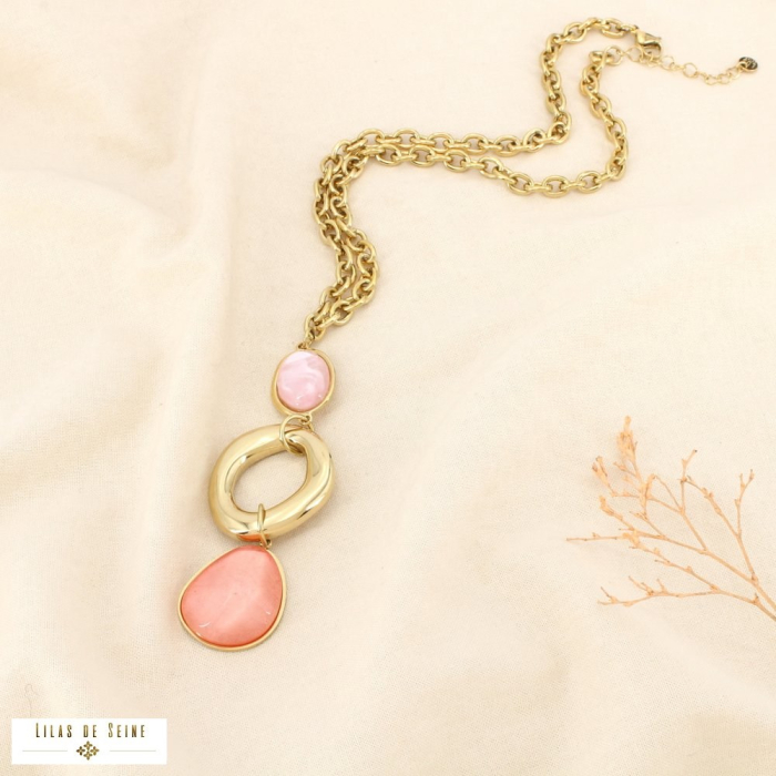 Le pendentif (env. L28 x H85 mm) se compose de plusieurs éléments superposés : un cabochon rond, un anneau ovale doré au volume organique, puis une goutte en résine translucide. Cette construction verticale allonge visuellement la silhouette et crée un point focal élégant au niveau du décolleté.