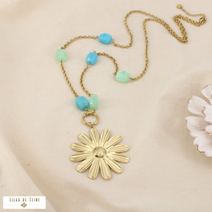 Sautoir fleur marguerite acier inox. résine marbrée 0126106 vert aqua