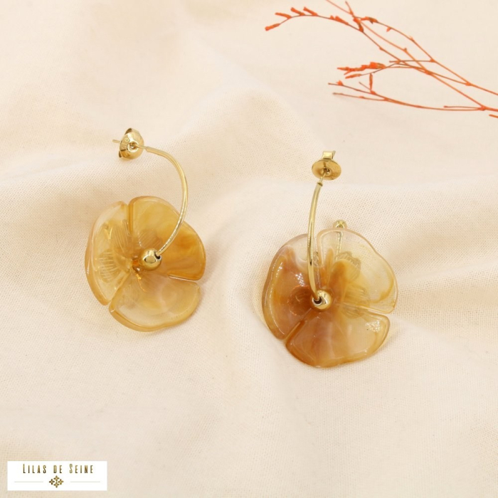 Ces créoles offrent une grande polyvalence : portées avec les deux fleurs, elles deviennent une pièce forte au style floral assumé. Avec la fleur en résine uniquement ou la fleur filigranée seule, elles prennent une allure plus minimaliste et contemporaine. Cette modularité en fait un accessoire particulièrement attractif pour les collections de bijoux mode.