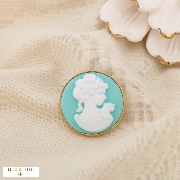 Élégante et intemporelle, cette broche pin’s ronde façon camée classique revisite l’esthétique des bijoux anciens dans une version moderne et tendance. Conçue en acier inoxydable et résine, elle met en valeur un délicat profil féminin en relief, inspiré des camées traditionnels. Son design raffiné et son style camée rétro chic à inspiration néoclassique en font un accessoire de caractère, idéal pour enrichir les collections d’accessoires mode.