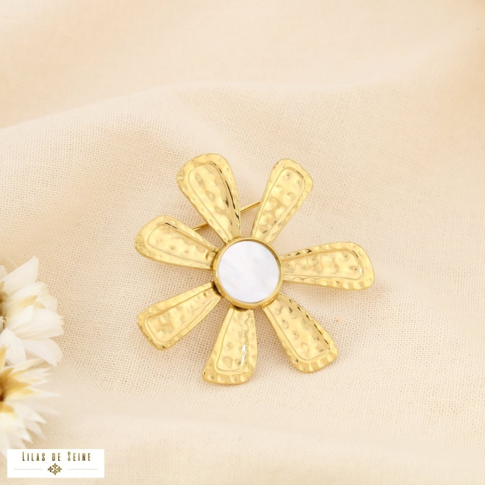 La broche se compose d’une fleur rayonnante aux pétales allongés en acier inoxydable à effet martelé. Cette texture subtile capte la lumière et crée un relief élégant qui met en valeur le design du bijou. Au centre, un cabochon rond en nacre apporte une touche douce et lumineuse, créant un contraste raffiné avec la finition dorée du métal.