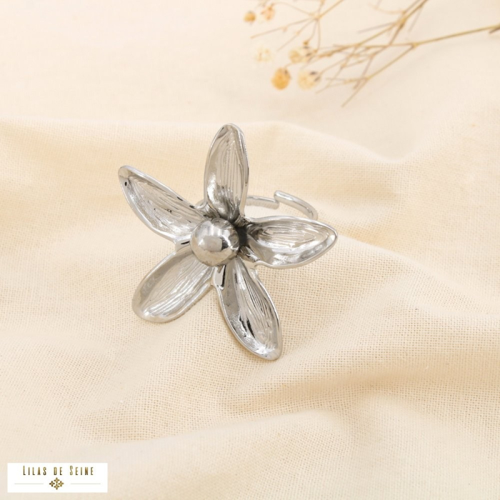 La bague présente une fleur sculpturale aux cinq pétales légèrement allongés, délicatement texturés pour rappeler les nervures naturelles d’une fleur. Au centre, une bille bombée et brillante apporte relief et équilibre à la composition. Réalisée en acier inoxydable, elle offre une finition lumineuse et durable, idéale pour un accessoire mode conçu pour accompagner les tendances actuelles.