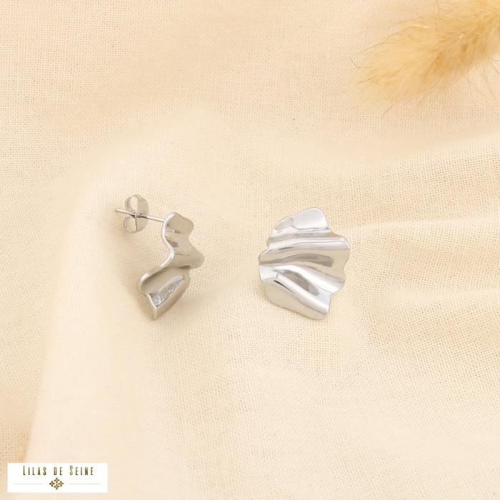 Chaque boucle présente une forme irrégulière légèrement ondulée rappelant un pétale ou une feuille stylisée. La surface texturée crée un subtil jeu de relief et de lumière, donnant au bijou un aspect sculptural tout en conservant une silhouette élégante et épurée. Réalisées en acier inoxydable, ces puces d’oreilles offrent un rendu brillant et durable, idéal pour un usage quotidien.