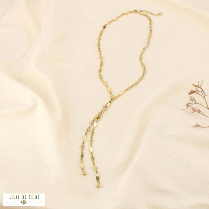 Les petites pastilles métalliques, disposées tout au long de la chaîne, créent un jeu de lumière discret et élégant. La forme en sautoir Y avec double chute apporte une dimension graphique et féminine, tout en allongeant visuellement la silhouette. Ce collier constitue ainsi une pièce idéale pour les boutiques recherchant des bijoux modernes et faciles à porter au quotidien.