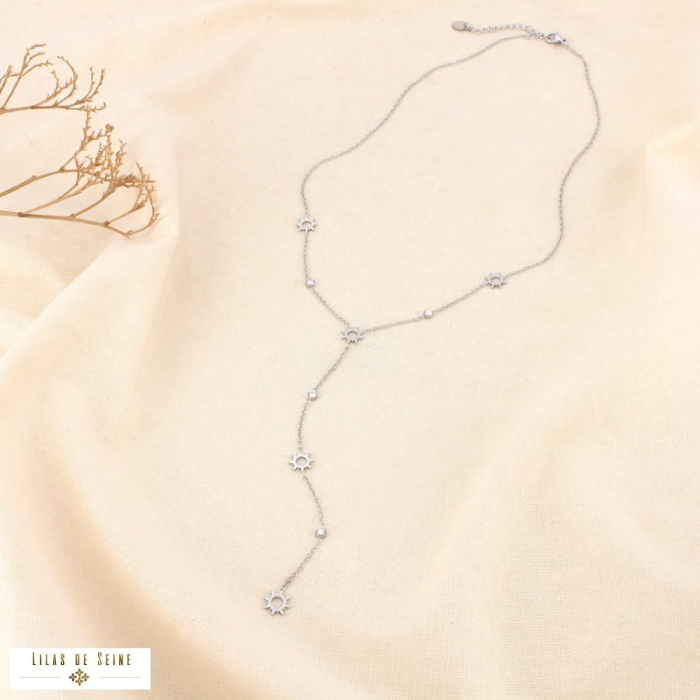 La silhouette en forme de Y met subtilement en valeur le décolleté grâce à une chute centrale élégante. Les petits soleils stylisés apportent une dimension symbolique et solaire tandis que les strass ajoutent une touche de brillance discrète. Ce collier délicat est une pièce idéale pour compléter des looks estivaux et féminins.