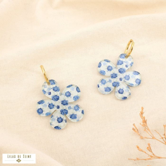 Le design associe une créole fine en acier inoxydable à un pendentif floral généreux en résine. La fleur stylisée à cinq pétales, décorée d’un motif délicat, apporte une dimension romantique et lumineuse au bijou. L’ensemble évoque un univers floral romantique, rétro porcelaine et bohème estival, très recherché dans les sélections mode actuelles.