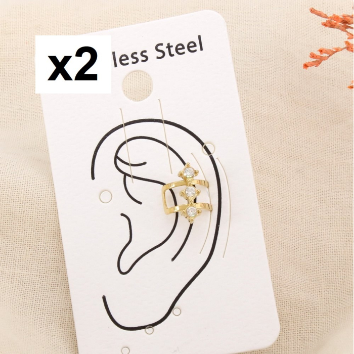 Proposez à votre clientèle un bijou à la fois raffiné et tendance avec ce lot de 2 bagues d’oreilles en acier inoxydable ornées de strass. Leur design structuré à double anneau, sublimé par trois strass alignés, apporte une touche lumineuse et sophistiquée à l’oreille.