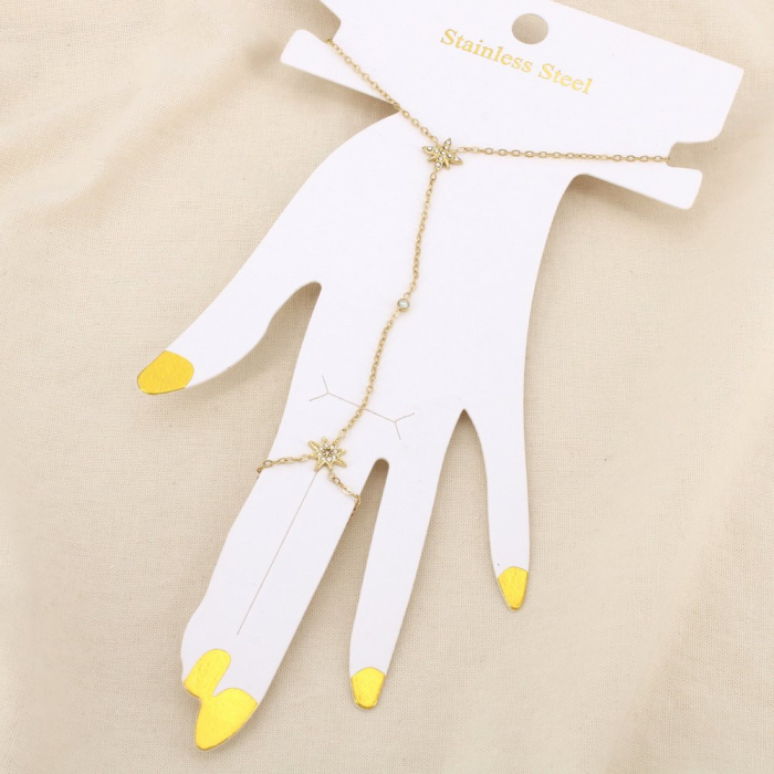 Ce bijou de main en acier inoxydable séduit par son design délicat et lumineux, structuré autour de motifs étoilés sertis de strass. Élégant et tendance, il apporte une touche distinctive à toute collection d’accessoires, répondant aux attentes des professionnels de la mode et des concept-stores en quête de pièces à forte valeur esthétique.