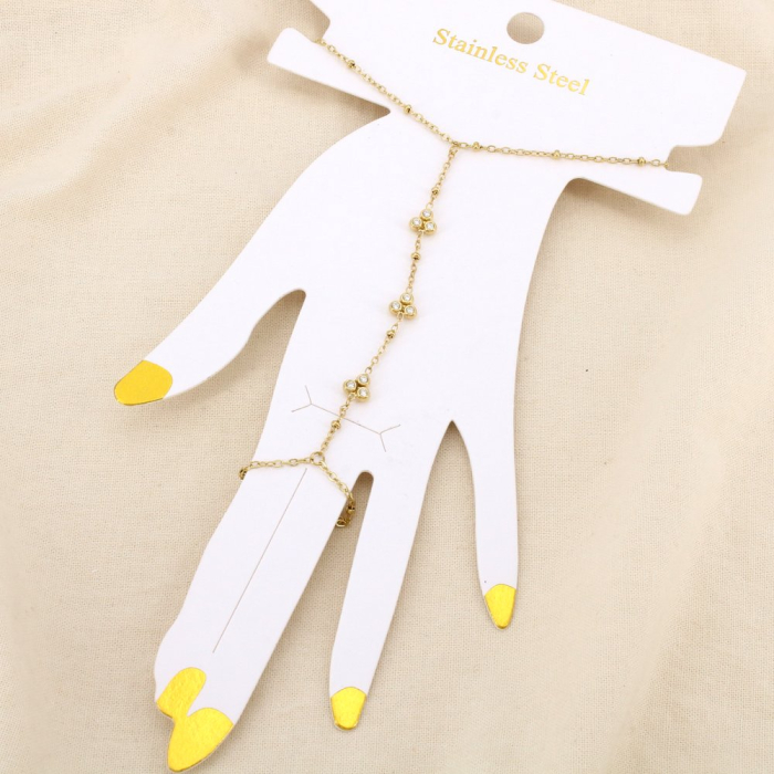 Ce bijou de main en acier inoxydable se distingue par son design raffiné ponctué de motifs sertis de strass, apportant une touche lumineuse et sophistiquée. Élégant et contemporain, il répond parfaitement aux attentes des professionnels de la mode et des concept-stores à la recherche de pièces différenciantes et à forte valeur visuelle.