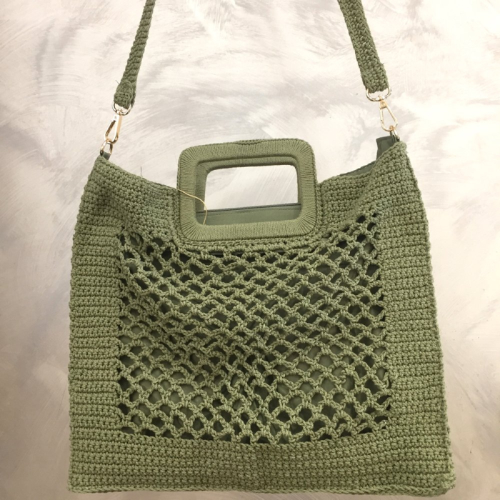 Ce sac se distingue par son travail de maille crochetée, alternant zones pleines et motif ajouré façon filet, créant un jeu de textures visuel très recherché. Sa structure souple est équilibrée par des finitions soignées et une tenue idéale pour un usage quotidien.