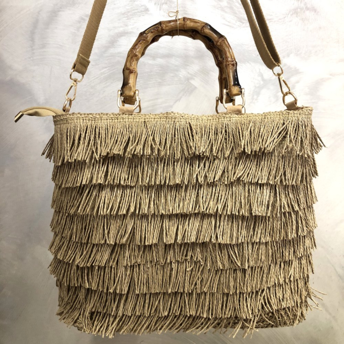 Ce sac se distingue par sa face avant ornée de franges superposées, créant un effet de volume et de mouvement particulièrement attractif en vitrine. L’arrière en tressage structuré apporte un équilibre visuel, alliant authenticité et tenue.