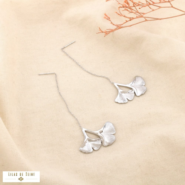 Ces boucles d’oreilles en acier inoxydable se distinguent par leur design aérien inspiré des feuilles de ginkgo. Montées sur une fine chaînette, elles offrent un mouvement fluide et élégant, renforcé par un motif végétal délicatement texturé. Leur silhouette allongée apporte légèreté et modernité, idéale pour compléter une sélection de bijoux tendance à forte valeur perçue.