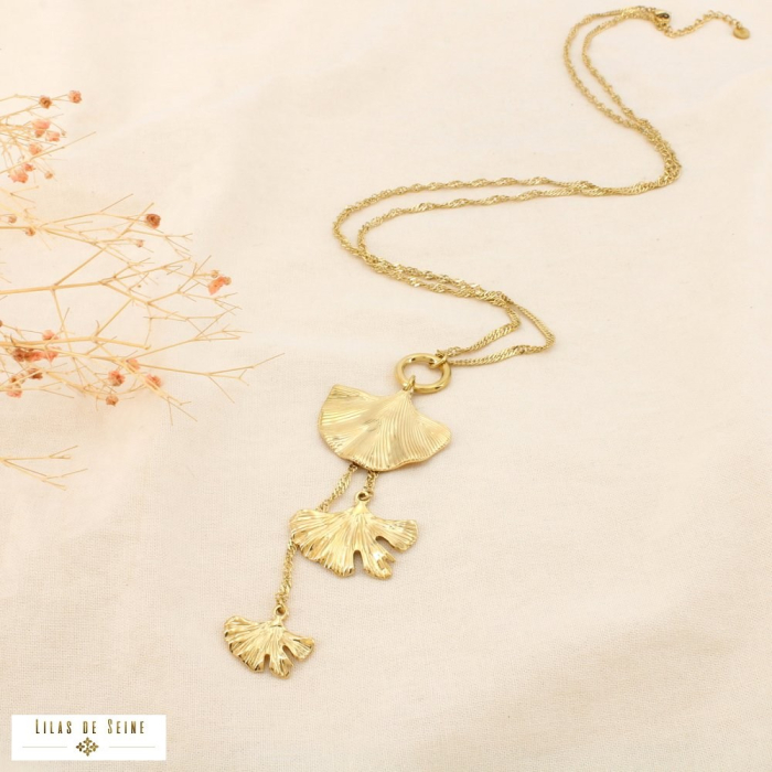 Ce collier sautoir en acier inoxydable doré se distingue par son pendentif structuré composé de feuilles de ginkgo en cascade. Son design allongé, associé à une chaîne fine et élégante, apporte mouvement et légèreté, tout en affirmant une signature visuelle forte. Une pièce idéale pour enrichir une sélection de bijoux tendance à destination des professionnels de la mode et des concept-stores.
