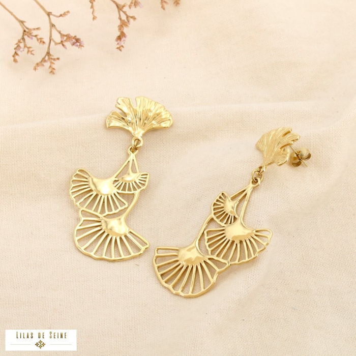 Apportez une dimension artistique et élégante à votre sélection avec ces boucles d’oreilles pendantes en acier inoxydable. Leur design ajouré en forme d’éventails superposés crée un jeu de volumes et de légèreté, idéal pour sublimer les silhouettes contemporaines.
