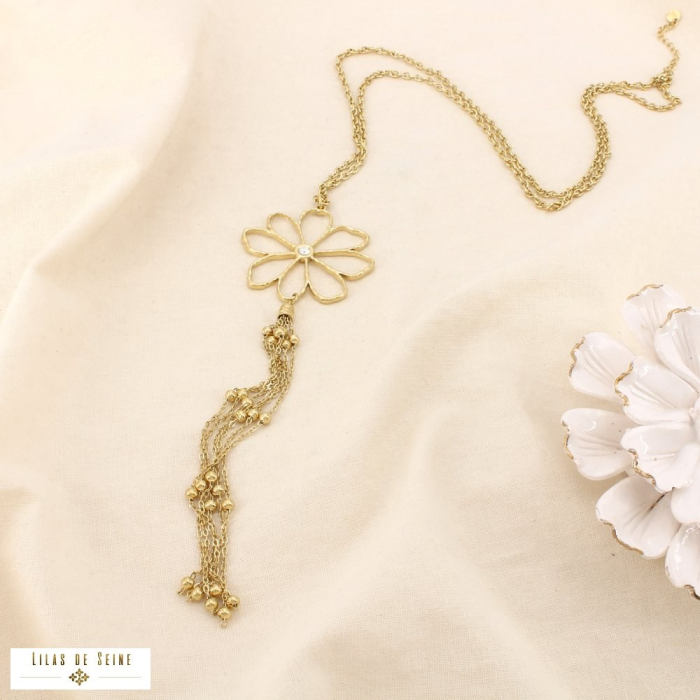 Collier sautoir acier strass pendentif fleur franges 0126107 doré