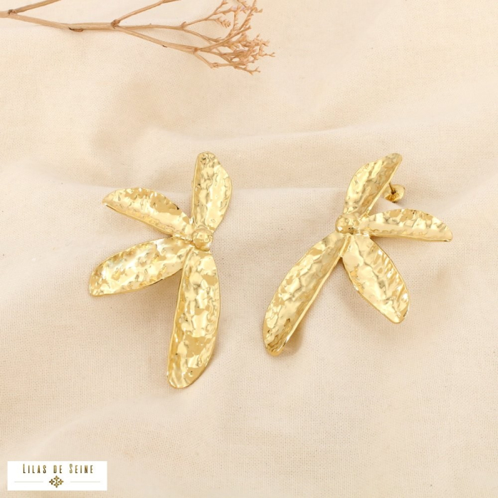 Affirmez une identité visuelle forte avec ces boucles d’oreilles XXL oversize en acier inoxydable, au design floral revisité. Composées de 4 pétales allongés à effet martelé, elles captent la lumière et créent un jeu de reflets irréguliers, évoquant un travail artisanal et organique.