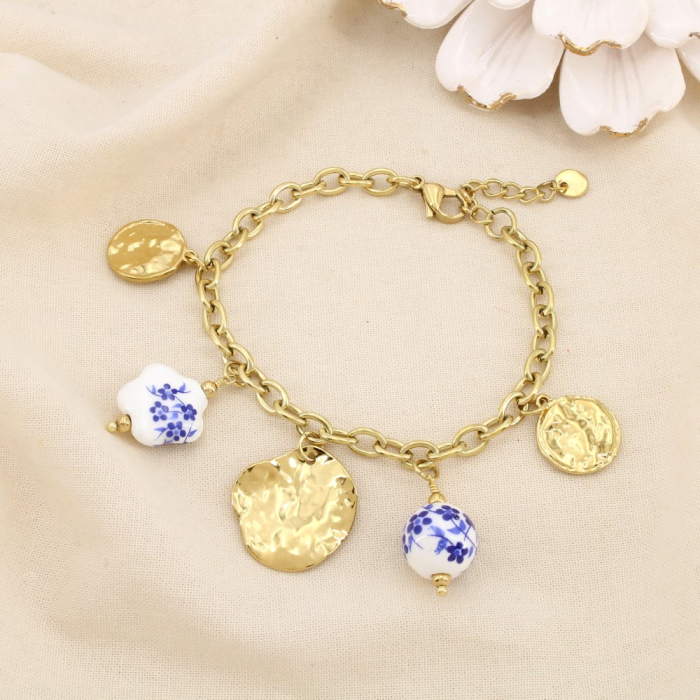 Complétez votre offre avec ce bracelet en acier inoxydable orné de charms en céramique, au design riche et raffiné. L’association d’éléments martelés dorés et de perles en céramique décorée confère à ce bijou un style à la fois tendance et artisanal.