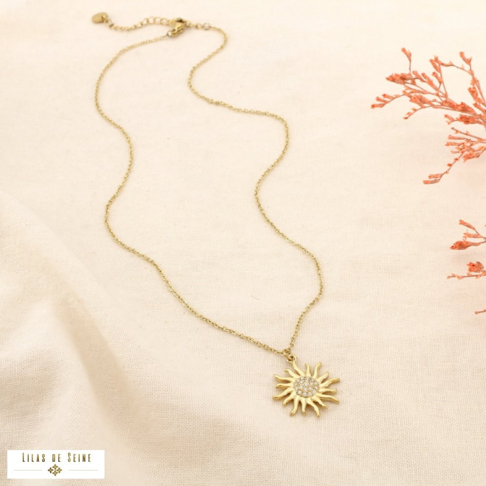Ce collier en acier inoxydable avec pendentif soleil orné de strass incarne une esthétique lumineuse et intemporelle. Son design délicat met en valeur un motif solaire finement travaillé, rehaussé par des strass scintillants qui captent subtilement la lumière.
