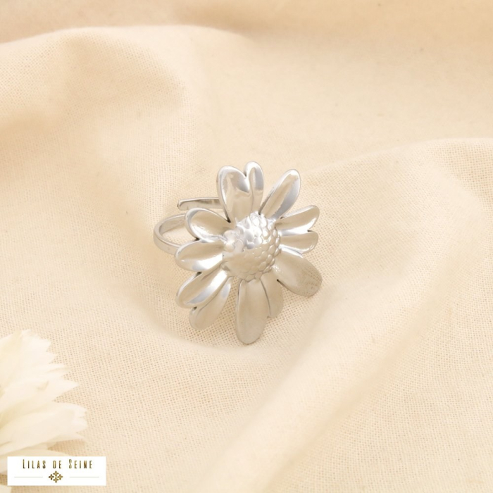 Affirmez une silhouette forte avec cette bague ouverte en acier inoxydable, sublimée par une marguerite au format généreux. Véritable pièce statement, ce bijou floral séduit par son volume, sa brillance et son design travaillé, disponible en finition dorée et argentée.