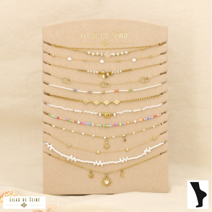 Présentées sur un support en tissu nubuck (15 x 21 cm) offert, ces chaînes de cheville offrent une solution de merchandising prête à l’emploi, idéale pour valoriser votre espace de vente.