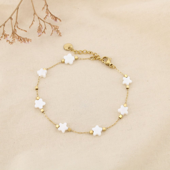 Composé d’une fine chaîne en acier doré ornée de motifs étoile en nacre d’environ 7 mm de diamètre, ce bracelet apporte une touche subtile de lumière et de douceur au poignet. Son esthétique minimaliste et raffinée répond pleinement à la demande actuelle pour les bijoux fins, symboliques et faciles à accumuler.