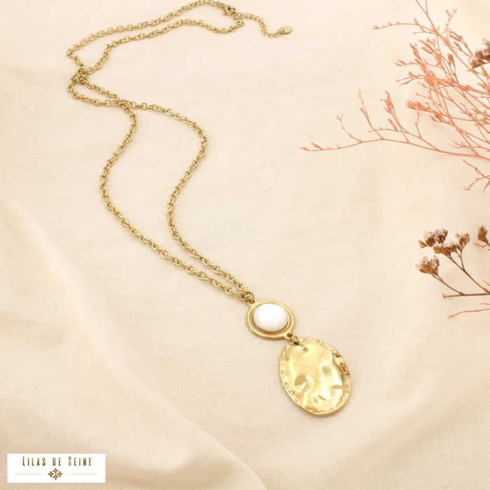 Monté sur une chaîne en acier doré à maille classique, ce collier est sublimé par un pendentif double composé d’un détail nacré et d’une médaille martelée effet texturé, offrant un jeu de matières subtil et une finition premium. Son pendentif de 23 x 50 mm environ attire naturellement le regard tout en conservant une allure sobre et élégante.