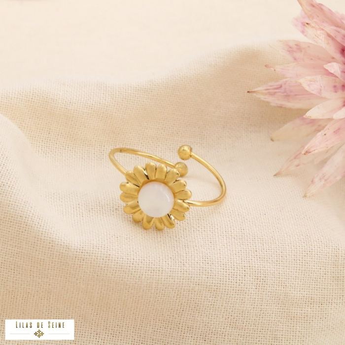 Son motif marguerite finement travaillé, sublimé par un cabochon central en nacre, apporte une touche de fraîcheur et de douceur à ce modèle au style délicatement romantique. Son anneau ouvert ajustable permet une adaptation facile à différentes morphologies, offrant confort et praticité au quotidien.