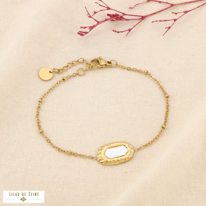Bracelet acier inoxydable martelé billes nacre 0226054 doré