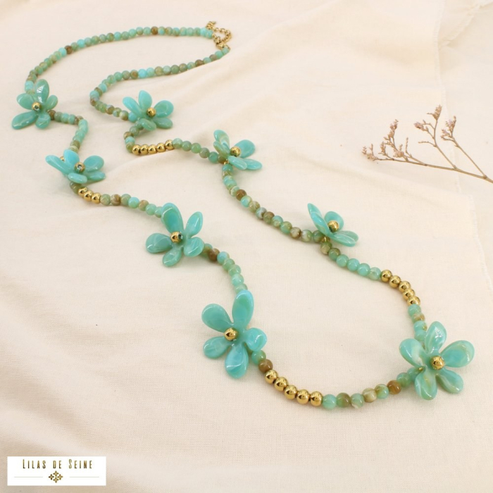 Apportez une touche de fraîcheur et de fantaisie à vos collections avec ce collier sautoir en acier inoxydable et résine, imaginé dans un esprit floral lumineux et résolument tendance. Composé de perles rondes en résine ponctuées de détails dorés et sublimé par plusieurs fleurs décoratives en relief, ce bijou long séduit par son allure joyeuse et son esthétique estivale affirmée.