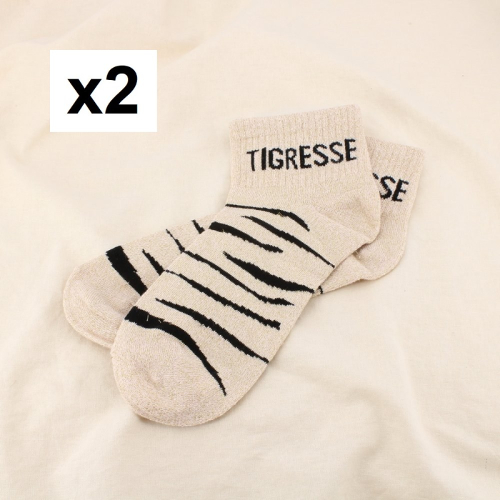 Proposées en lot de 2 paires, ces socquettes se distinguent par leur motif animalier inspiré du tigre et leur message en majuscule, dans une esthétique à la fois audacieuse et actuelle.