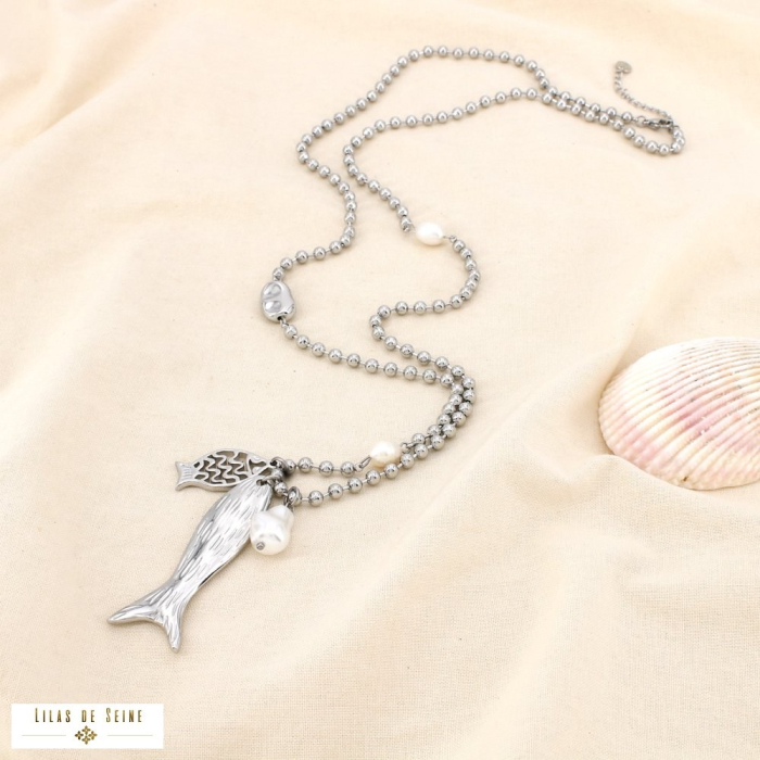 Ce collier sautoir en acier inoxydable séduit par son design raffiné aux accents marins, combinant une chaîne à billes contemporaine avec des éléments décoratifs inspirés de l’univers aquatique. Les pendentifs en forme de poissons, associés à des perles d’eau douce et à une perle de culture en résine, créent un équilibre harmonieux entre modernité et naturalité.