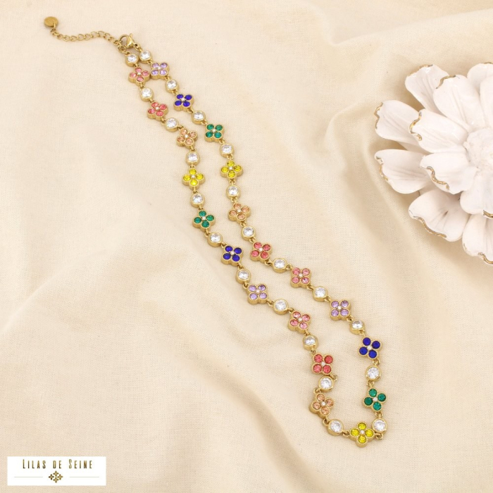 Ce collier en acier inoxydable séduit par son design délicat et rythmé, associant des motifs trèfles colorés à des strass lumineux. Pensé pour une clientèle professionnelle exigeante, il s’inscrit dans une offre tendance, facile à intégrer dans une sélection de bijoux contemporains et attractifs en point de vente.