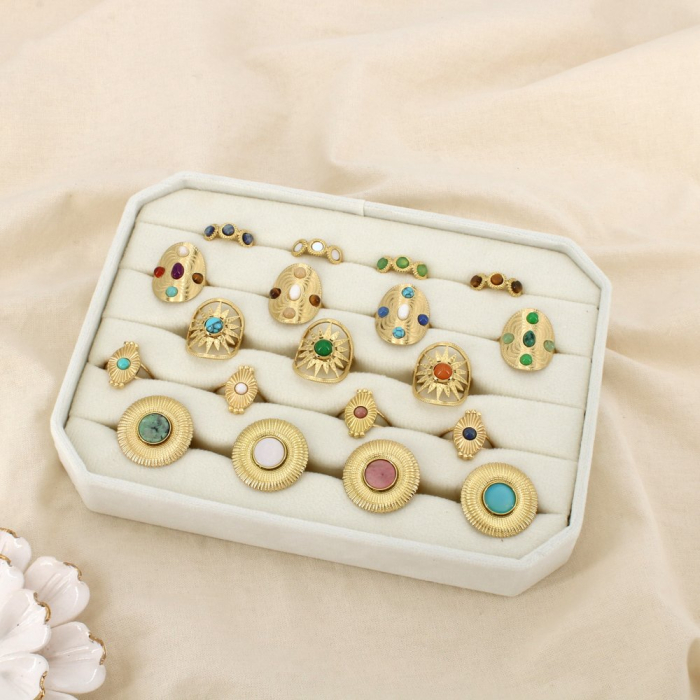 Valorisez votre espace de vente avec cet ensemble de 19 bagues réglables en acier inoxydable, sublimées par des pierres naturelles et touches de nacre. Cette sélection complète propose une grande diversité de designs : formes solaires, motifs texturés, volumes généreux et bagues plus fines, permettant de répondre à une large variété de styles.